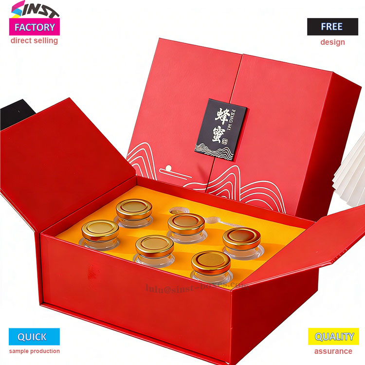 ဤအနီရောင်ပျားရည်လက်ဆောင်သေတ္တာသည် အရည်အသွေးမြင့် မာကျောသောကတ်ထူပြားများနှင့် ပြေပြစ်သောလှိုင်းပုံစံများကို ပေါင်းစပ်ထားကာ ခေါက်သိမ်းနိုင်သောဖွဲ့စည်းပုံနှင့် သယ်ယူရလွယ်ကူစေရန်အတွက်ဖြစ်သည်။ ပျားရည်လက်ဆောင်သေတ္တာသည် ဖန်အိုးအရွယ်အစားအမျိုးမျိုး (ပျားရည်/လုပ်အားပေးများအတွက်) ပံ့ပိုးပေးထားပြီး ပါဝင်ပစ္စည်းများကို ထိန်းထားရန် စိတ်ကြိုက်ရေမြှုပ်ထည့်သွင်းပါရှိပါသည်။ အားလပ်ရက်လက်ဆောင်များ၊ လုပ်ငန်းလက်ဆောင်များနှင့် ကျန်းမာရေးထုတ်ကုန်ထုပ်ပိုးမှုများအတွက် ဥရောပ၊ အမေရိကန်နှင့် အရှေ့တောင်အာရှဈေးကွက်များတွင် လက်ဆောင်ဦးစားပေးမှုများနှင့်အညီ အလွန်သင့်လျော်ပါသည်။ ဤသေတ္တာသည် ပေါ့ပါးပြီး စတိုင်ကျကာ ထုတ်ကုန်တန်ဖိုးကို တိုးမြင့်စေပြီး ကုန်ကျစရိတ်သက်သာသည်။