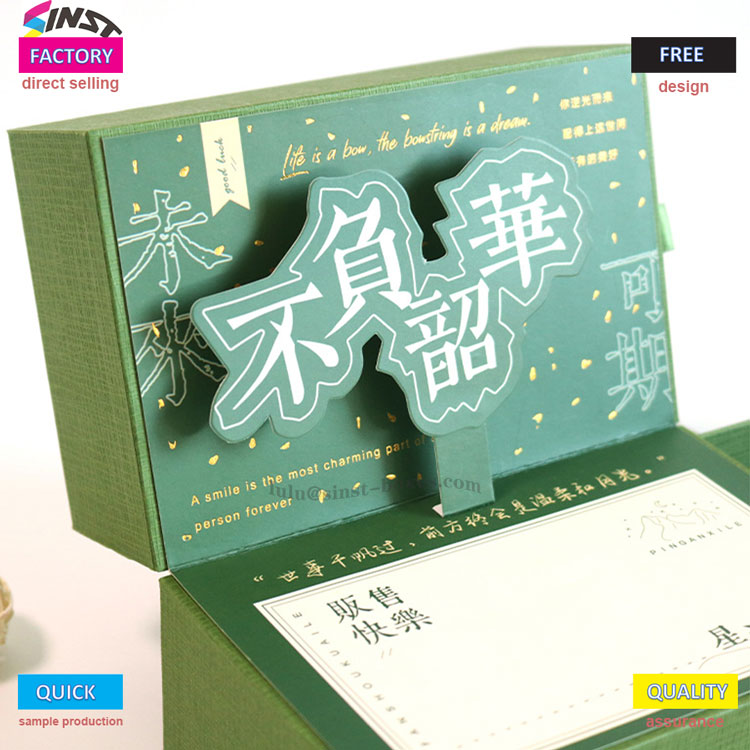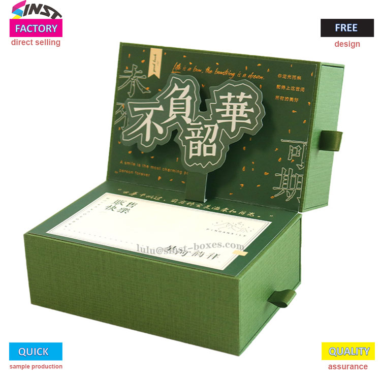 SINST ထုပ်ပိုးခြင်းနှင့် ပုံနှိပ်ခြင်းမှ တိုက်ရိုက်ရောင်းချသည့် ဤရေမွှေးလက်ဆောင်သေတ္တာသည် လတ်ဆတ်သောအစိမ်းရောင်ကို အဓိကလေသံအဖြစ် ယူဆောင်သည်။ အံဆွဲအမျိုးအစားသေတ္တာကိုယ်ထည်တွင် သုံးဖက်မြင်အနုပညာဇာတ်ကောင်များနှင့် ရွှေရောင်အလှဆင်မှုများ တပ်ဆင်ထားသည်။ ရေမွှေးလက်ဆောင်သေတ္တာ၏ဘေးဘက်တွင် "Shao" နှင့် "Qi" တို့ဖြင့် အလှဆင်ထားပြီး အတွင်းကူရှင်အချောင်းသည် တည်ငြိမ်ပြီး မွှေးပျံ့ကာ နူးညံ့သိမ်မွေ့မှုကို ပြသသည်။ အနုပညာခံစားမှုနှင့် ထုံးတမ်းစဉ်လာသဘောတို့ ယှဉ်တွဲတည်ရှိမှုသည် စိတ်ခံစားမှုများကို ထုတ်လွှင့်ရန်အတွက် အရည်အသွေးရွေးချယ်မှုဖြစ်သည်။