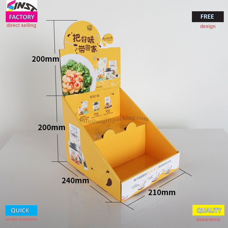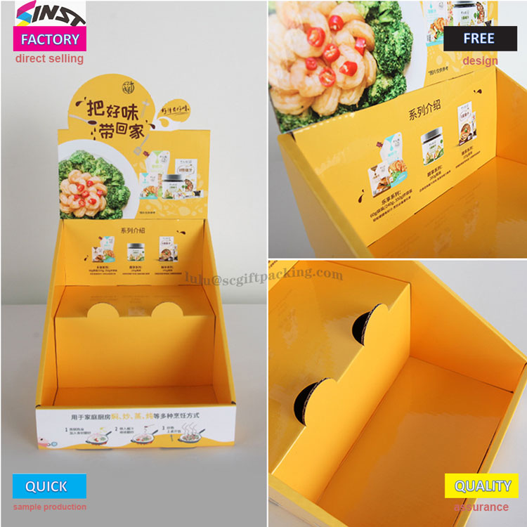 ဒီစူပါမားကတ် countertop cardboard display box ကိုရာသီအလိုက် sloping ဒီဇိုင်းပါရှိပါတယ်။ အမွှေးအကြိုင်မျက်နှာပြင်အနေဖြင့်အသုံးပြုသောအခါ, မှောင်မိုက်အညိုရောင်သစ်သားအစေ့ box ကိုရွှေဖောင့်များတပ်ဆင်ထားပြီး Octagonal, Carnamon နှင့်မွှေးသောအရွက်များကိုအရောင်ခြယ်ထားသည့်ရွှေဖောင့်များတပ်ဆင်ထားသည်။ Box Cover တွင် "Braised Remible" ၏သေးငယ်သောဥပမာလည်းရှိသည်။ ဖောက်သည်များကအမဲသားကိုစွပ်စွဲလိုပါက "Braised အသား၏ညီအစ်ကိုသုံးယောက်" ကိုအလွယ်တကူစုဆောင်းနိုင်သည်။